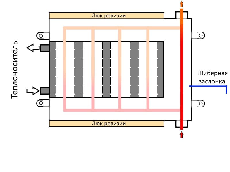 - при открытой шиберной заслонке, горячие газы почти полностью проходят от входа к выходу. Небольшая часть проходит через жаровые трубы, а так же греет стенку теплообменника,